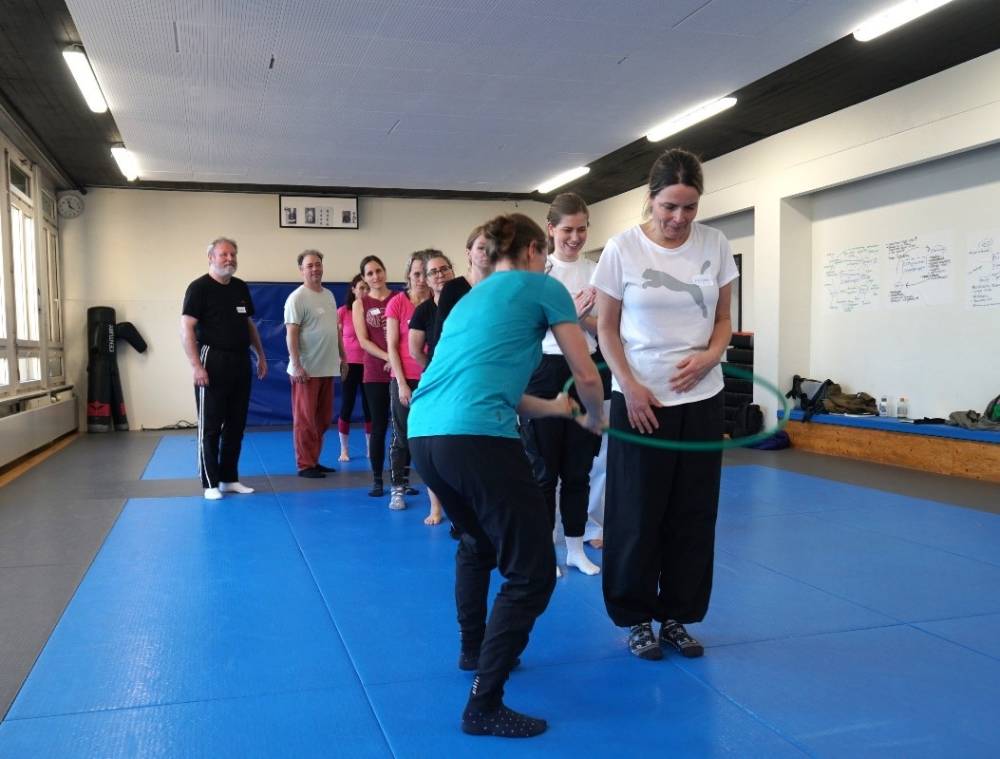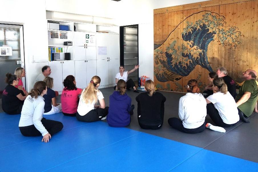 Gewaltprävention mit Jugendlichen, deren Gehirn, Körper und Leben gerade im Umbausind, bietet einiges an Herausforderungen aber auch viele Möglichkeiten. Die Kursleiterinnen Katharina Eisenring, Clarissa Walther und Elena Grebenarov haben die Teilnehmer:innen ( externe Fachleute aus der Gewaltprävention, Schule & Kampfkunst, sowie auch viele Pallasmitglieder) mit auf eine Reise genommen, in der sie sich oft in die Rolle der Jugendlichen versetzen durften.